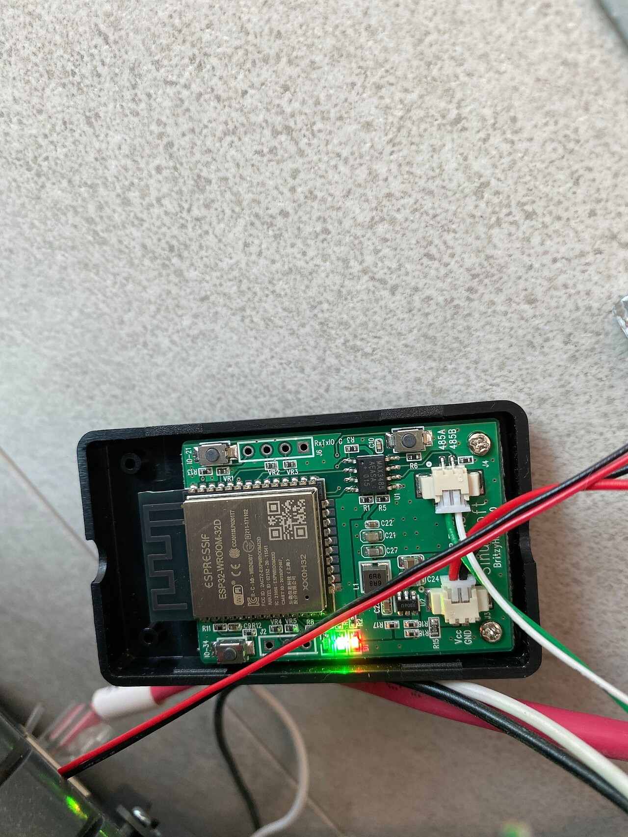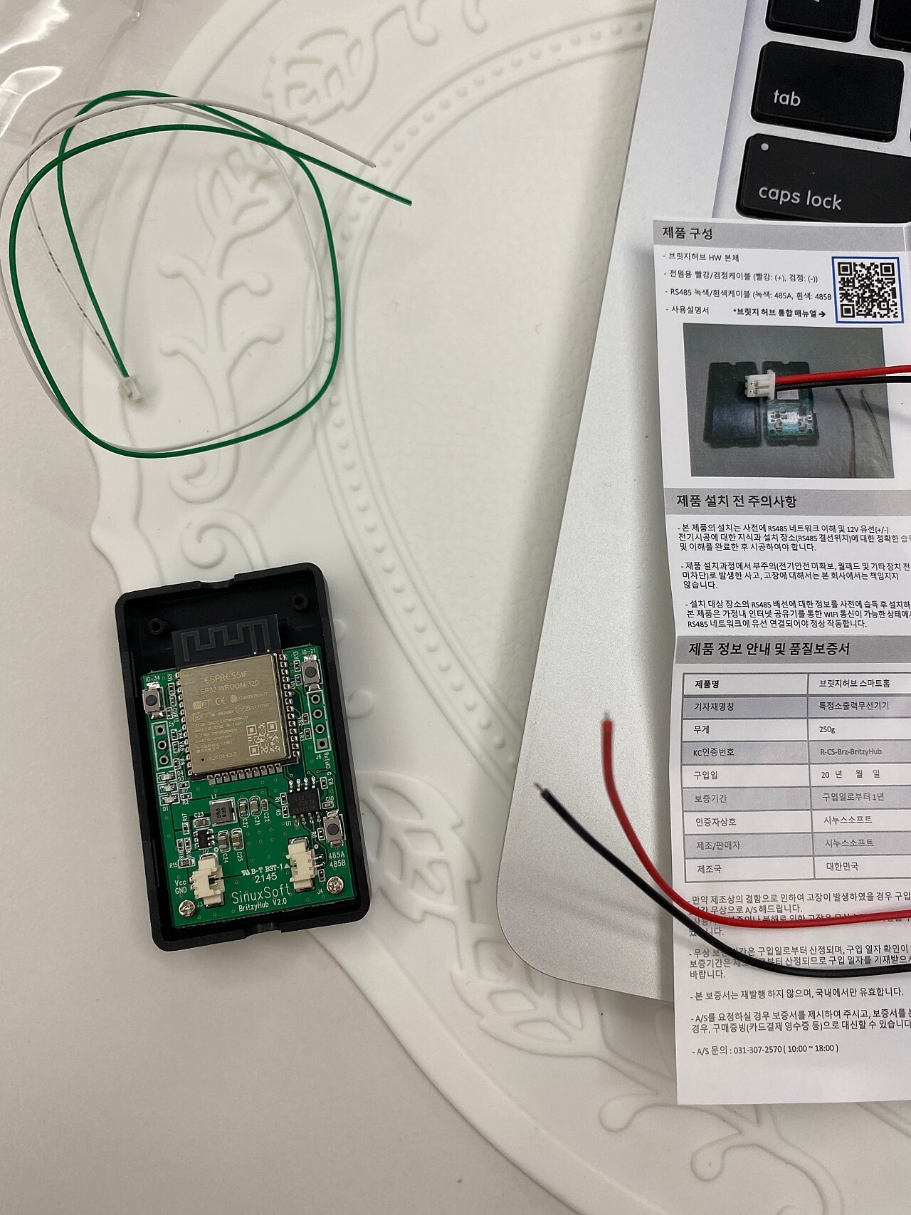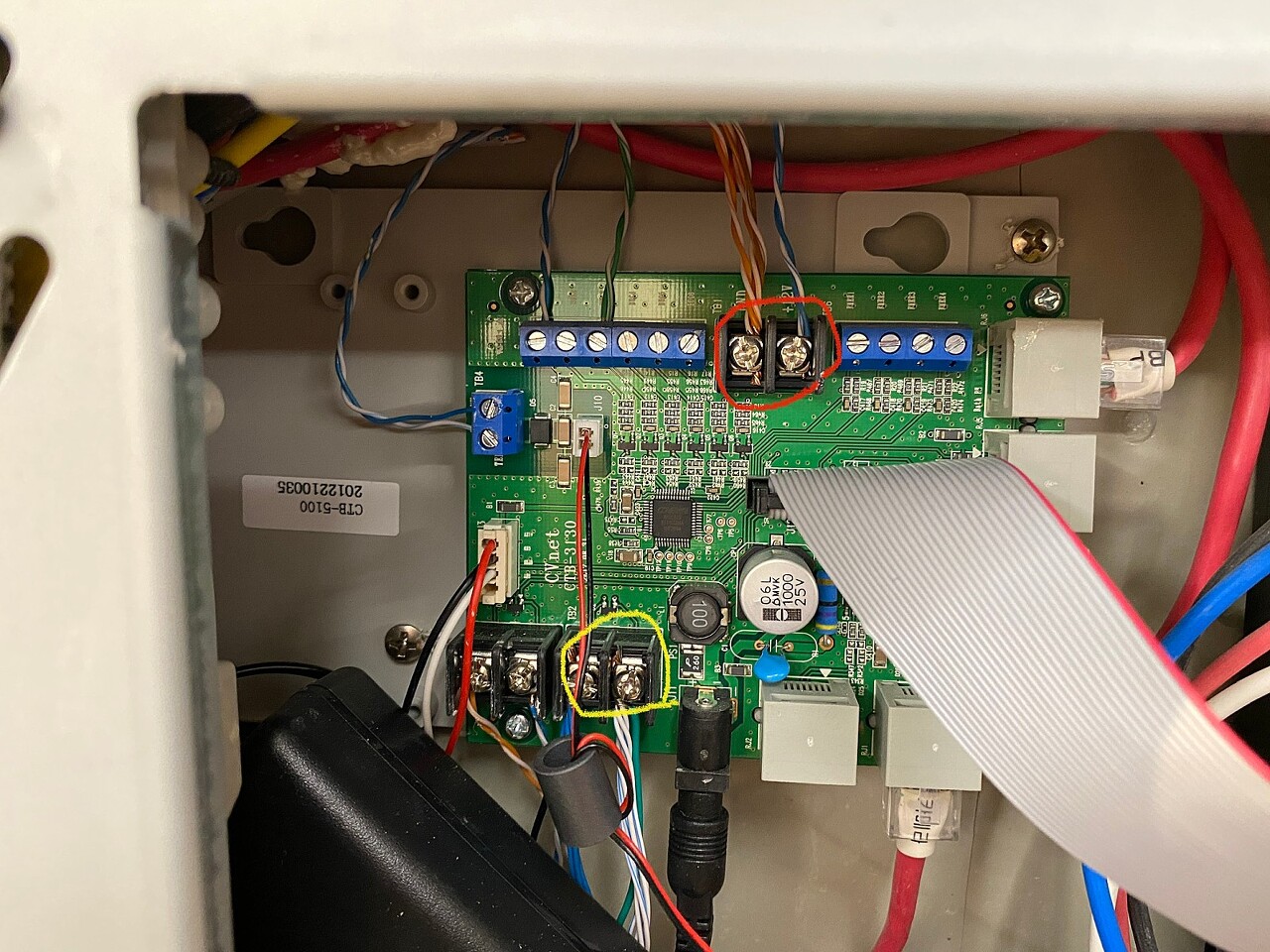 - 설명서를 자세히 읽고, 월패드를 뜯은 후에 빨간색 원 (그라운드, 전압선), 노란색 원 (RS485 통신선) 과 연결 후 패킷 테스트를 합니다. (이것도 구매 후 설명서를 보시면 됩니다.)