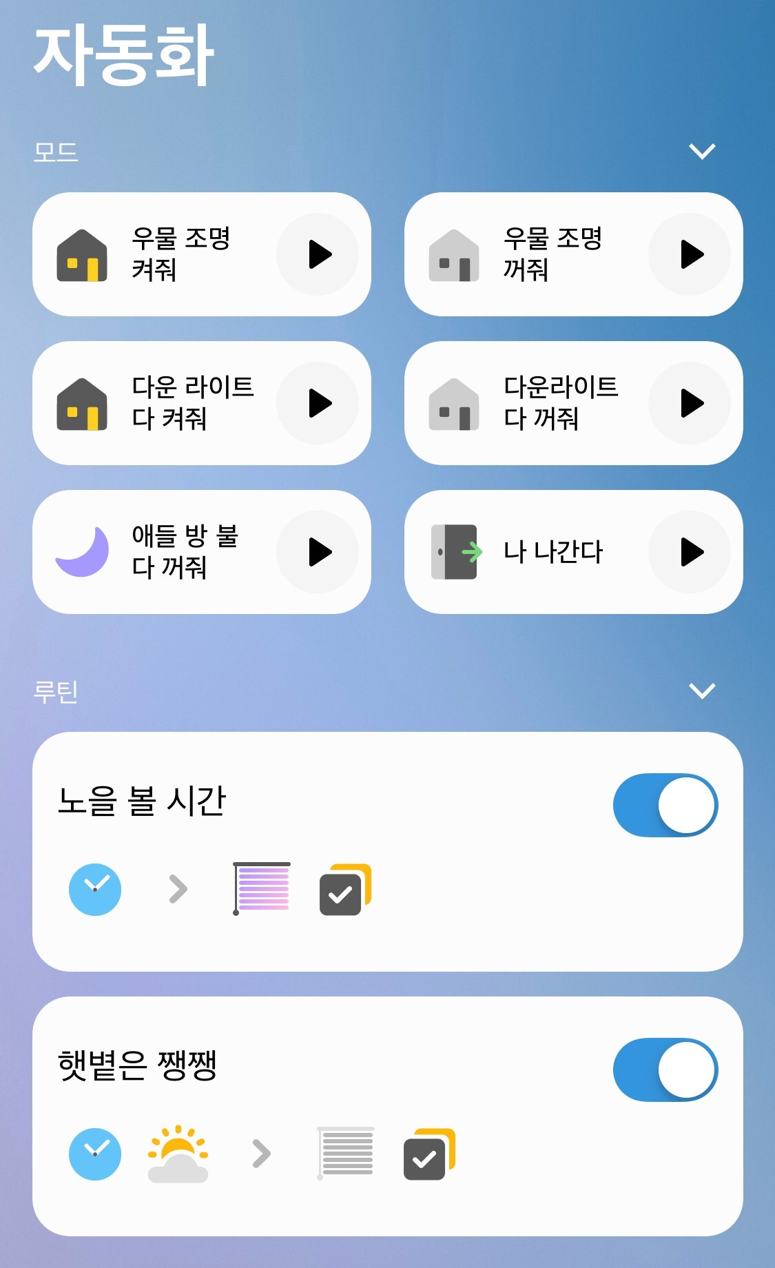 - 밝은 날 낮에 커튼을 치도록 자동화 하거나, 노을 볼 시간은 내부 조명을 모두 끄고 커튼을 열기도 하고 스마트콘센트를 사용해 "잘자~" 라고 음성 메세지 보내면 난방 조절, 전기장판 키고 아이들에게 잘자라는 방송하고 아이들 방 불 꺼주는 걸 안방에서 자기 전에 실행 할 수 있습니다.